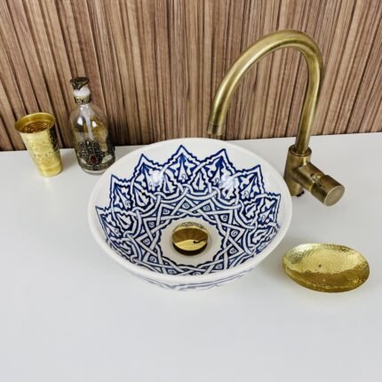 Hand-Painted Ceramic Sink with 14K Gold Edge – Moroccan Style Vanity Basin.