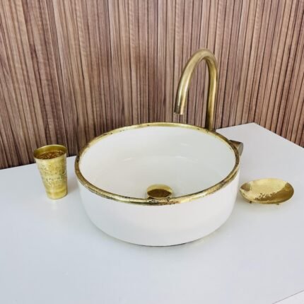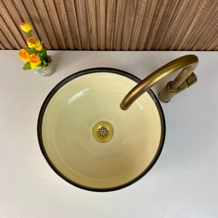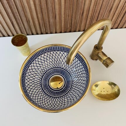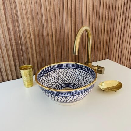 Hand-Painted Ceramic Sink with Brass Rim – Elegant Moroccan Design