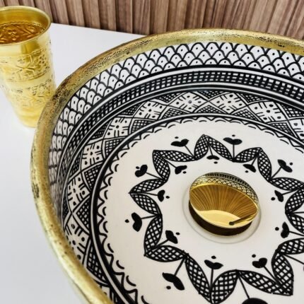 Handcrafted Ceramic Basin with Brass Rim – Moroccan Bathroom Elegance
