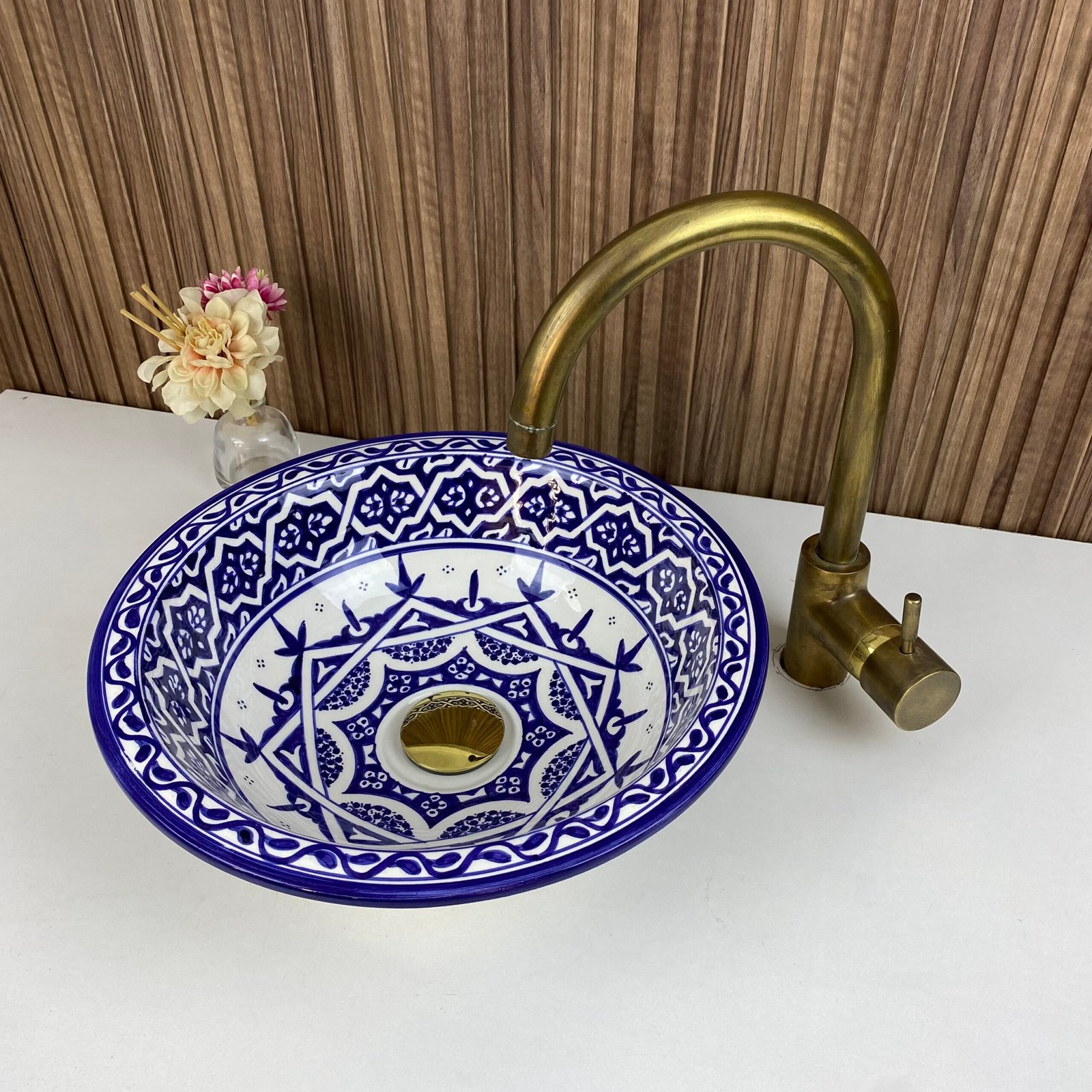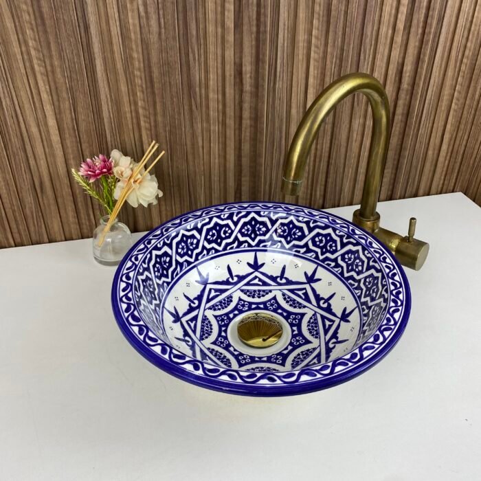 Artisan Ceramic Vessel Sink – Moroccan Style with Brass Accent
