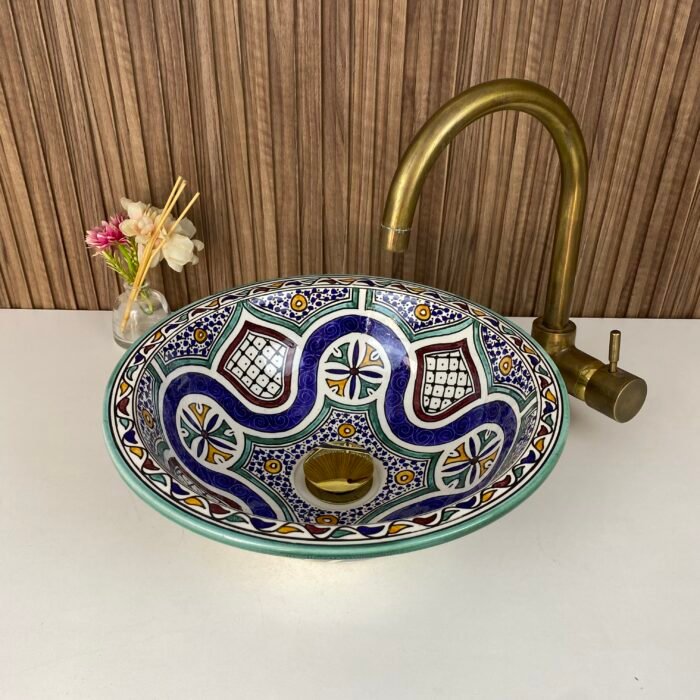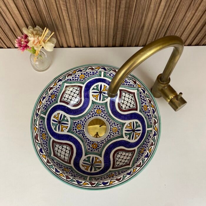 Moroccan Ceramic Vessel Sink – Brass Accent Bathroom Wash Basin