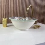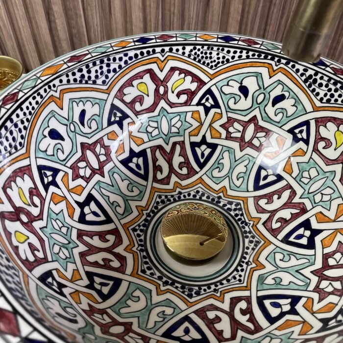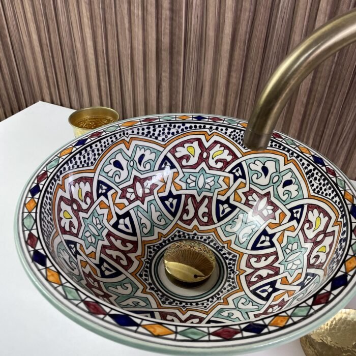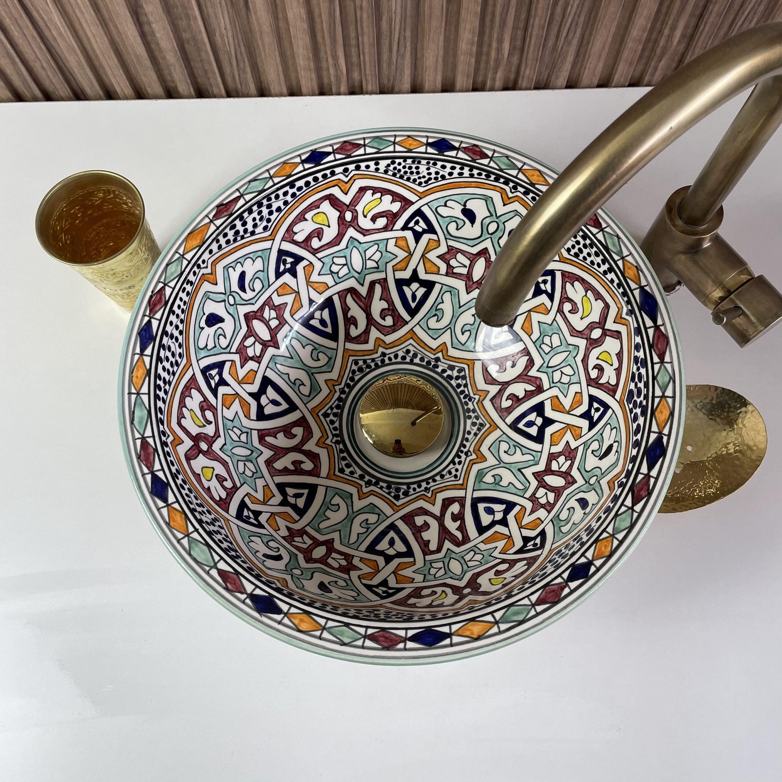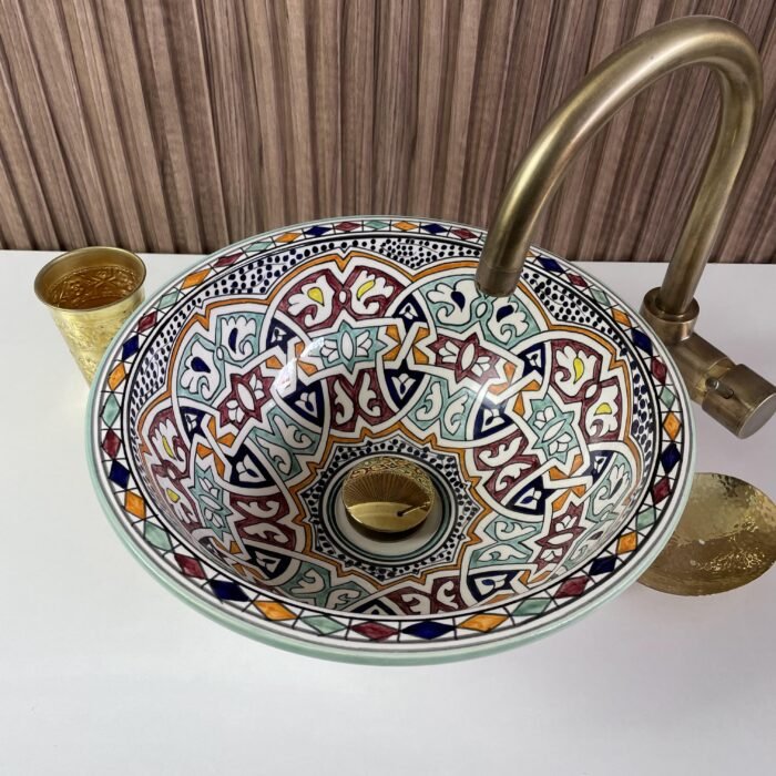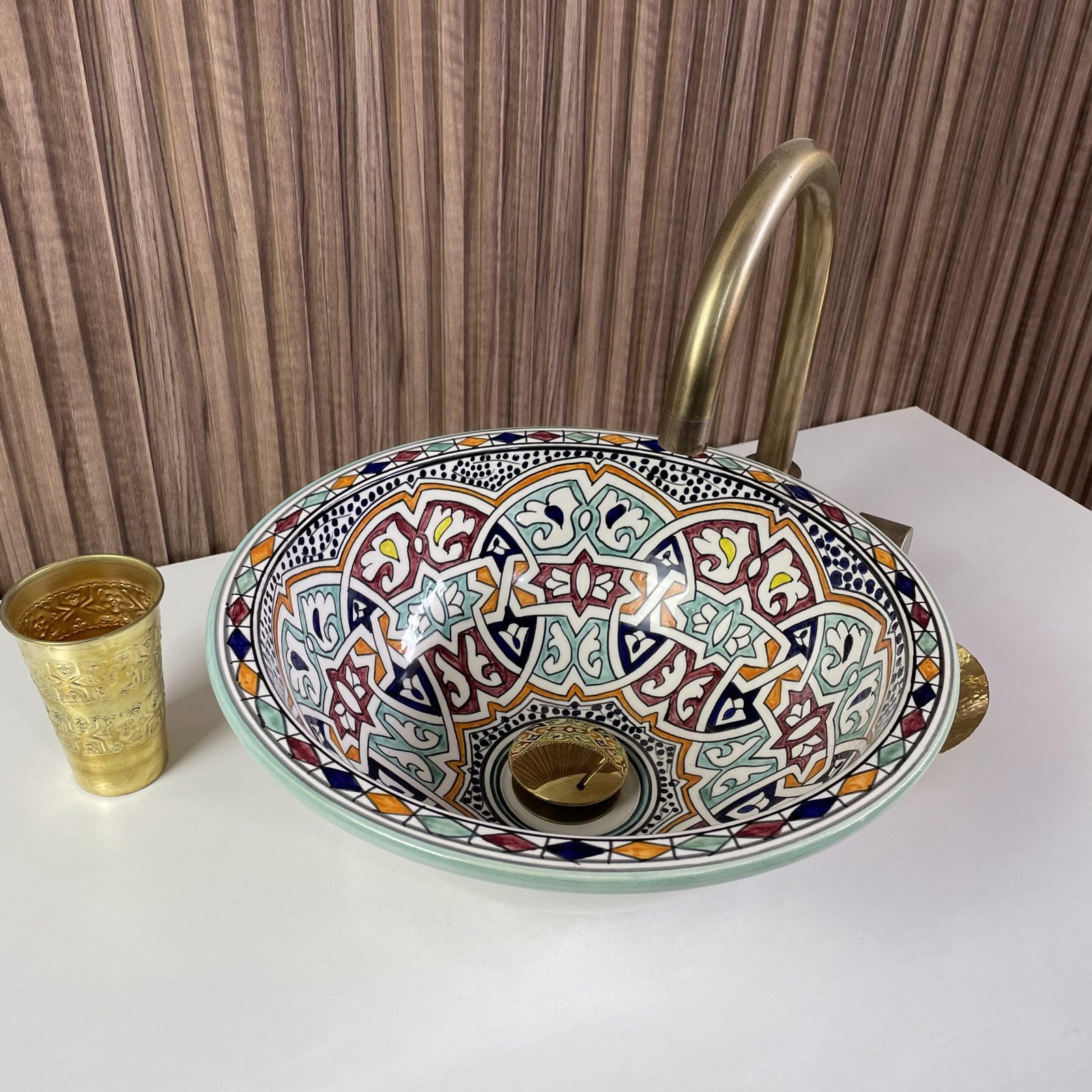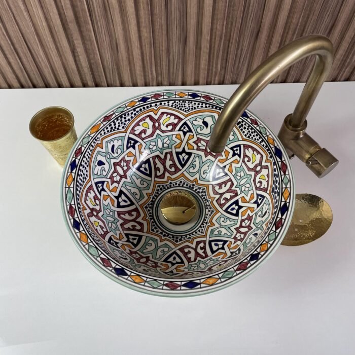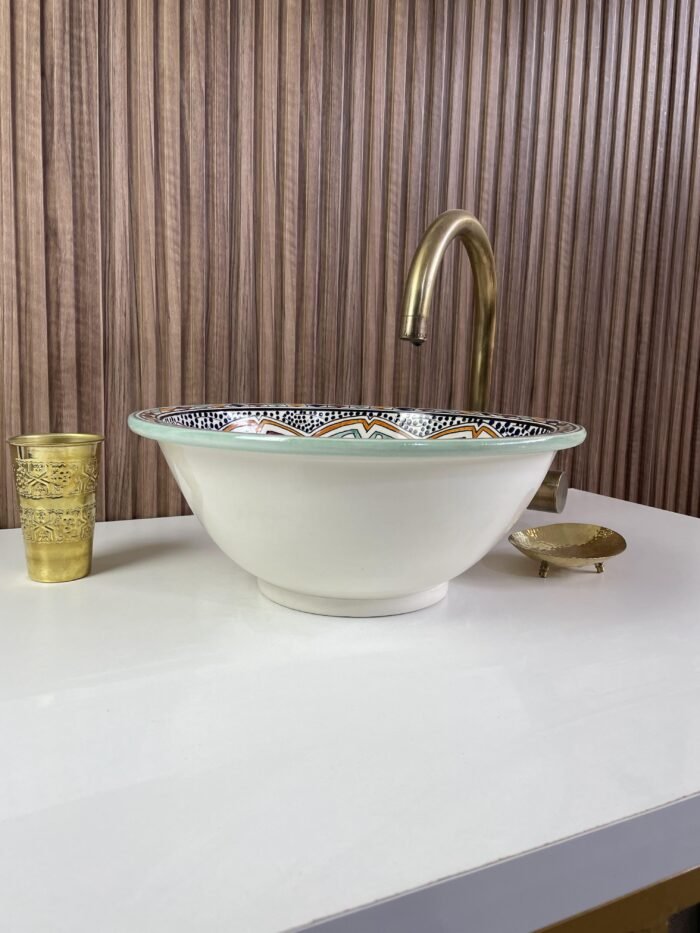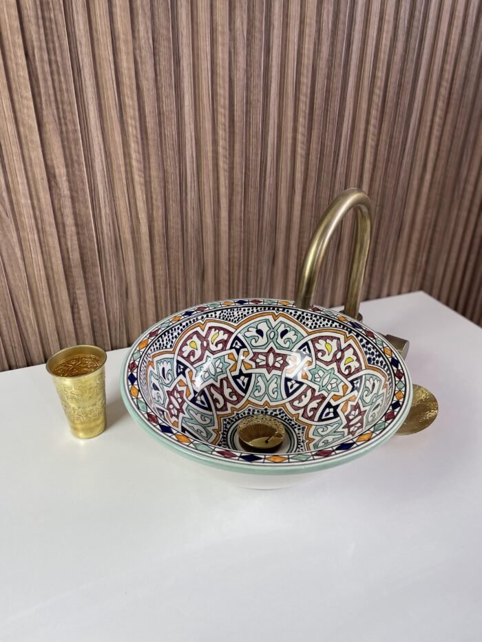 Moroccan Ceramic Vessel Sink – Brass Accent Bathroom Wash Basin