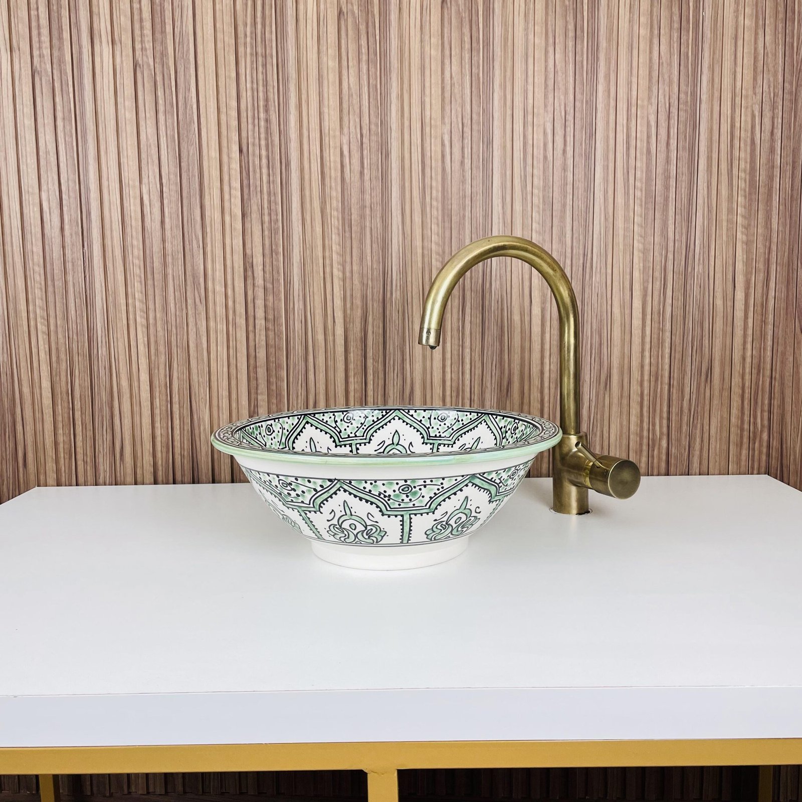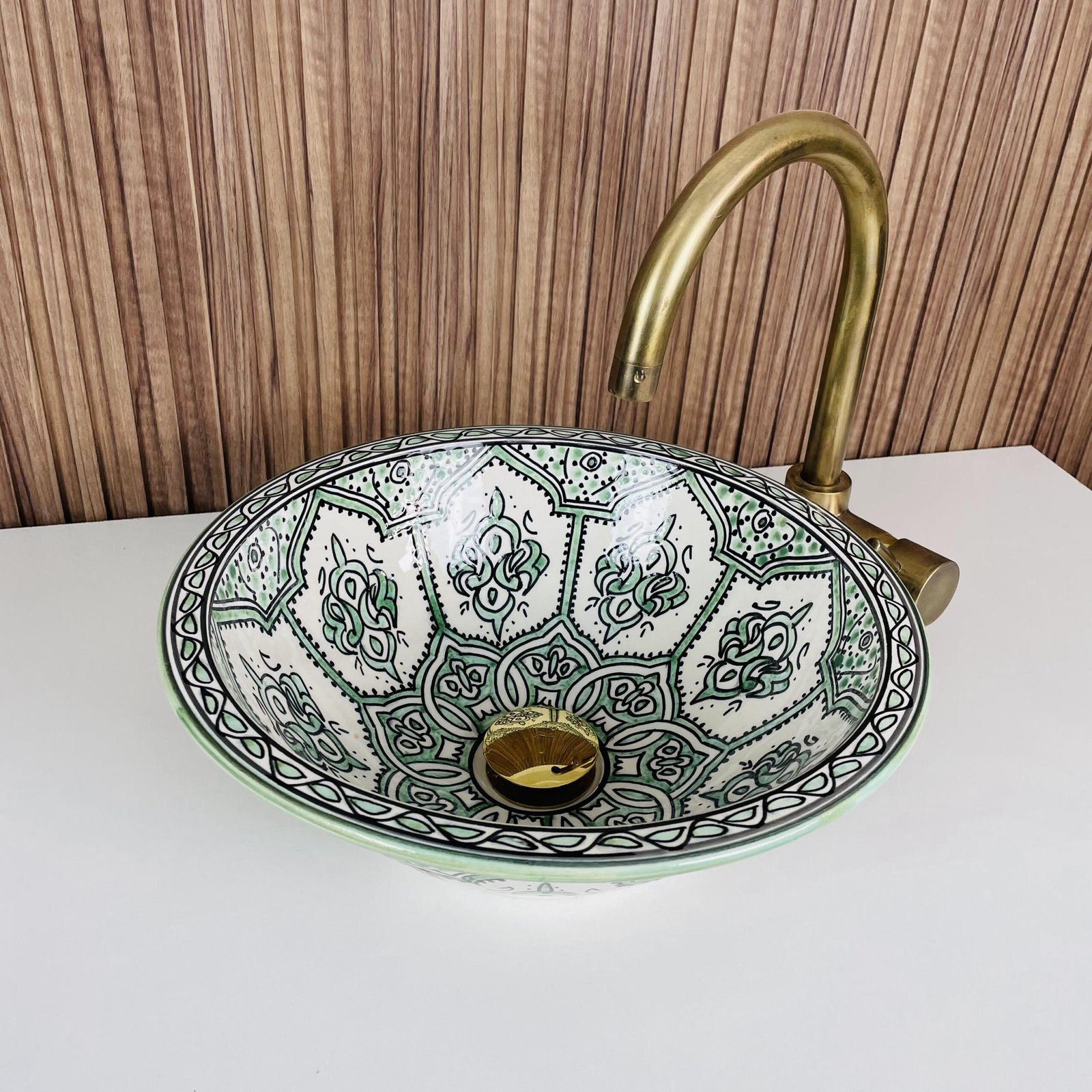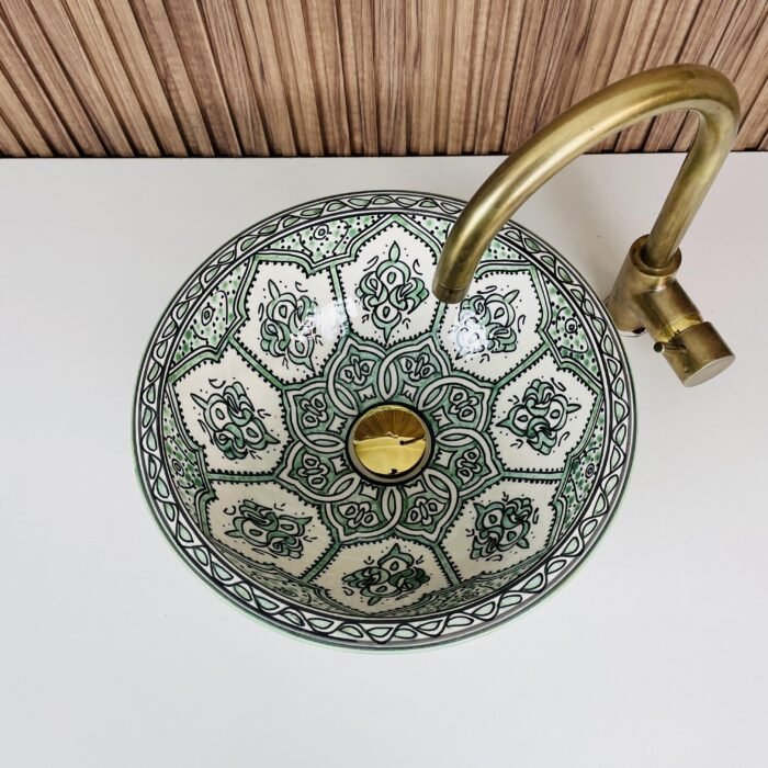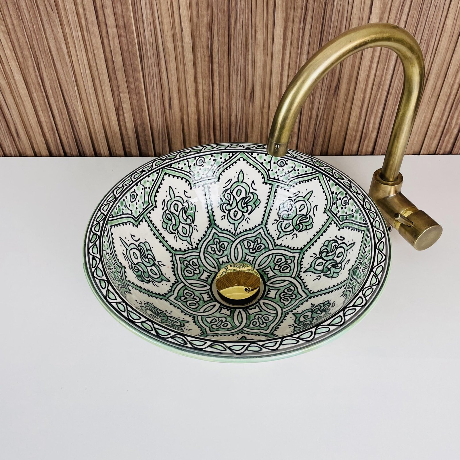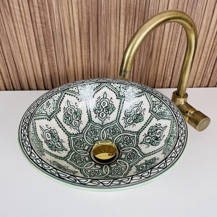 Moroccan Ceramic Vessel Sink – Brass Accent Bathroom Wash Basin