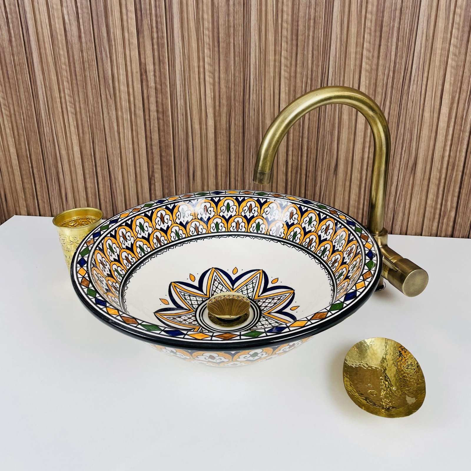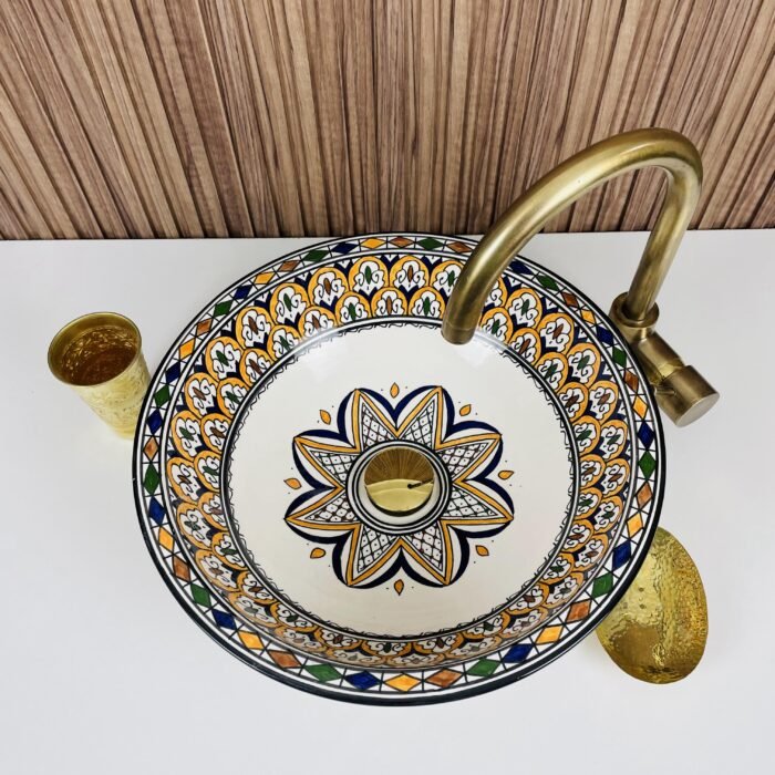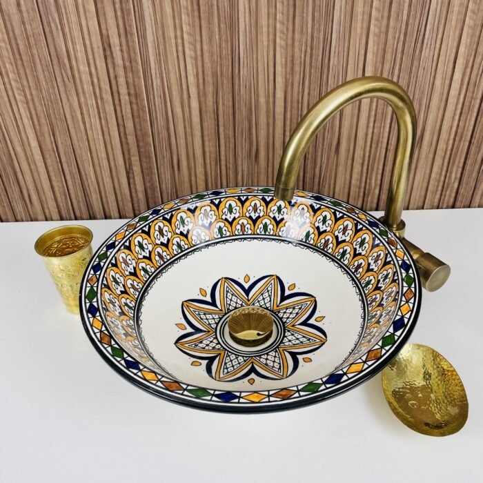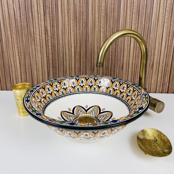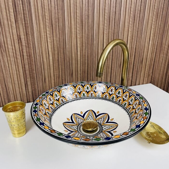 Moroccan Ceramic Vessel Sink – Brass Accent Bathroom Wash Basin