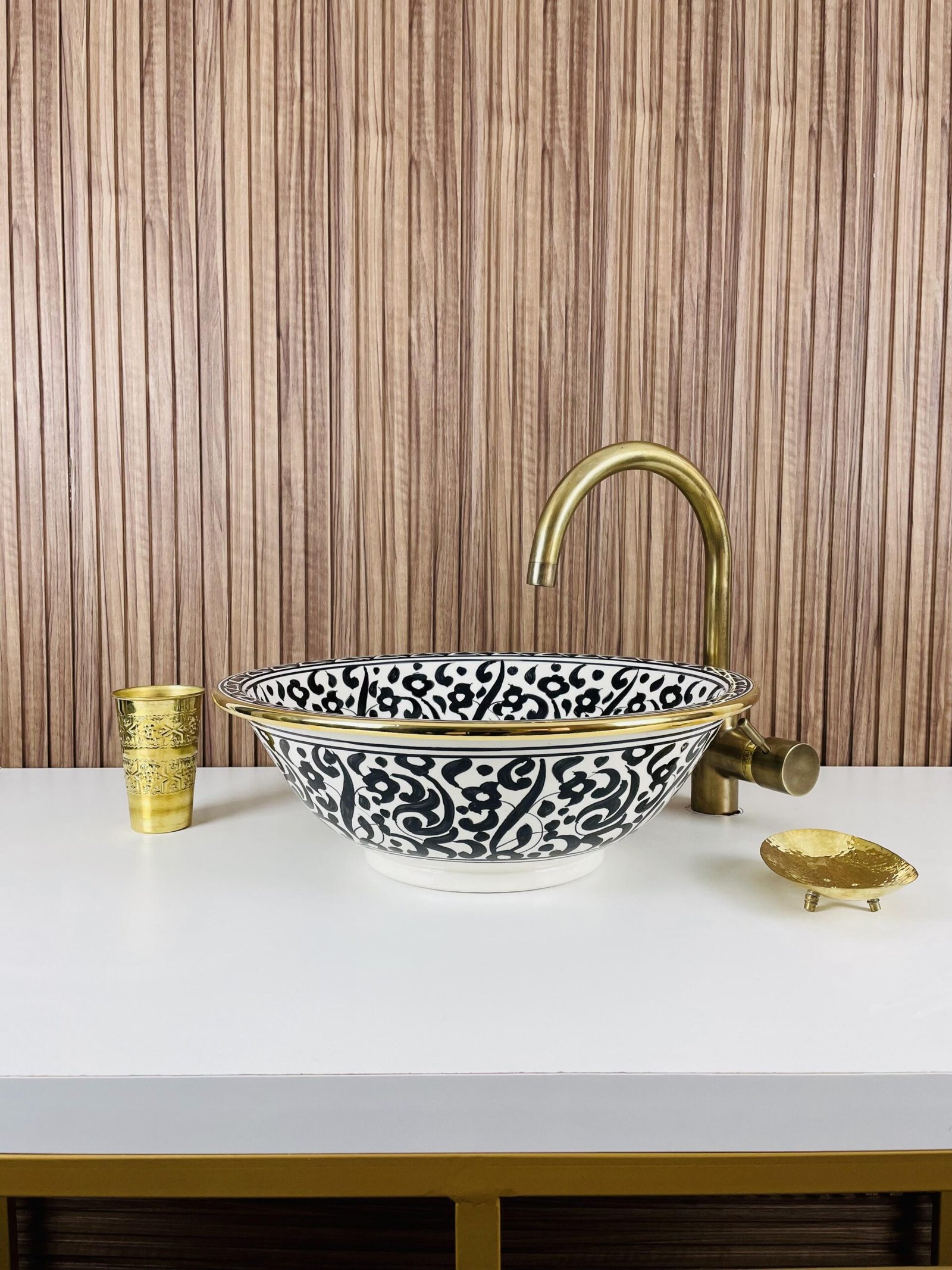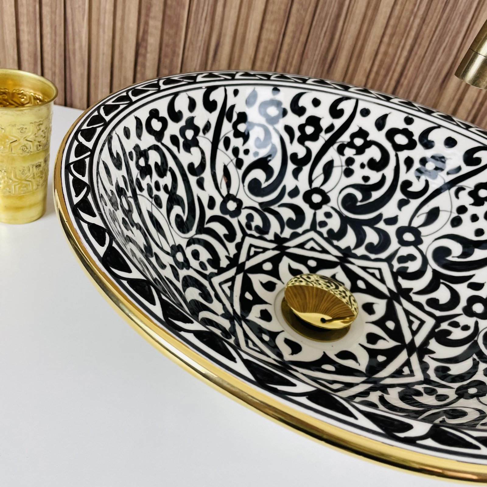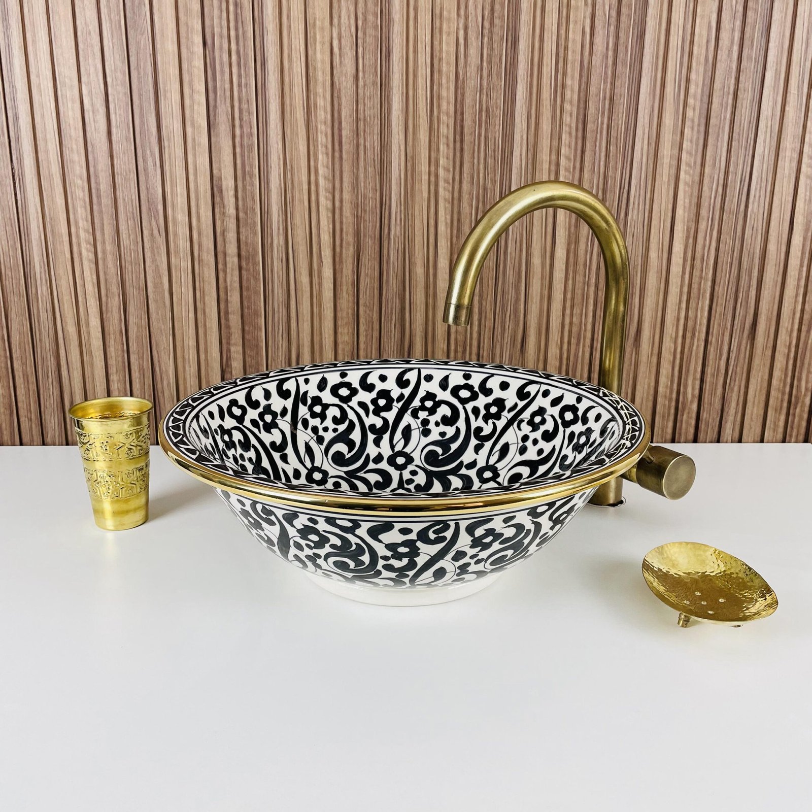 Elegant 14K Gold Edge Ceramic Sink – Handmade Moroccan Basin