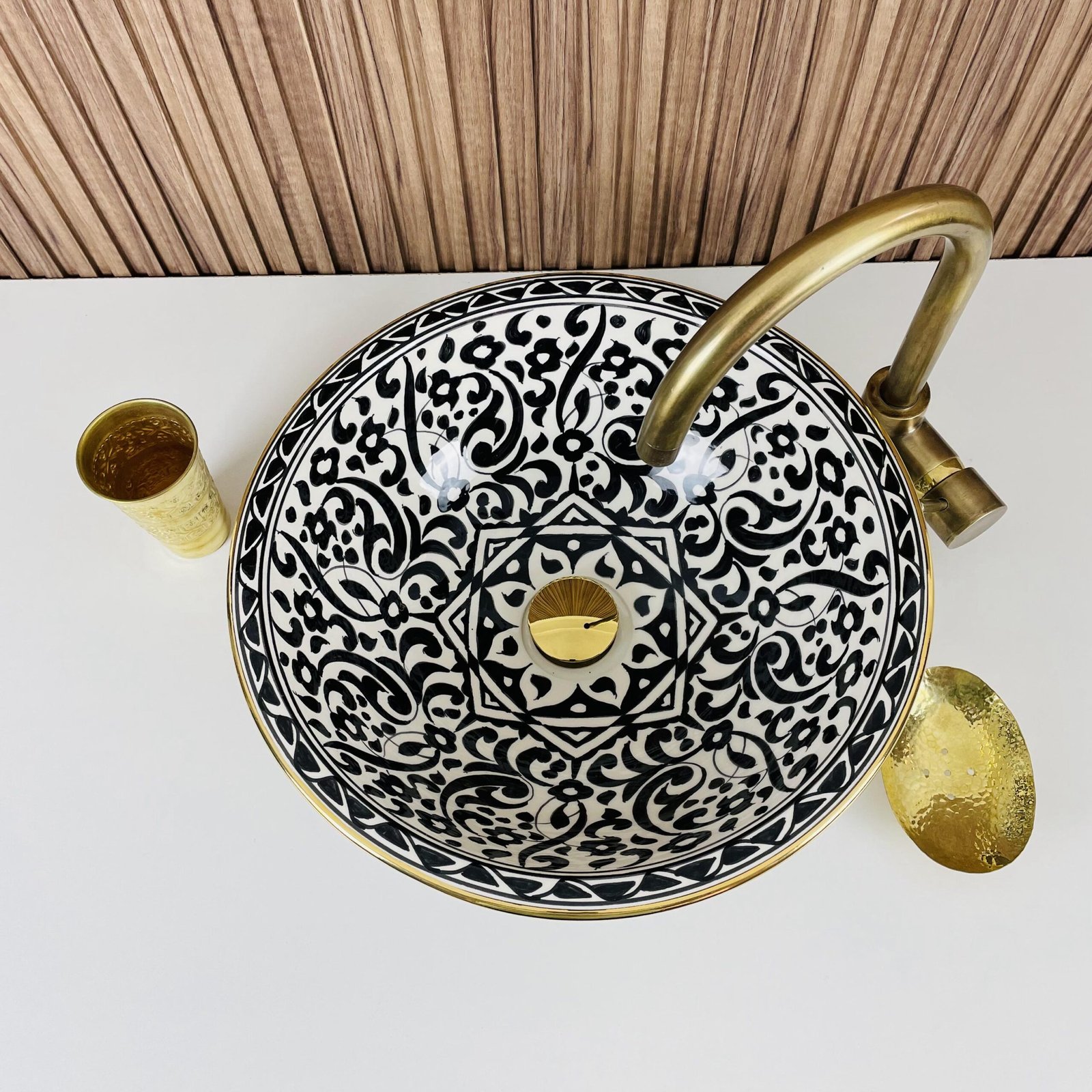 Moroccan Ceramic Vessel Sink – Brass Accent Bathroom Wash Basin