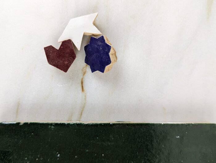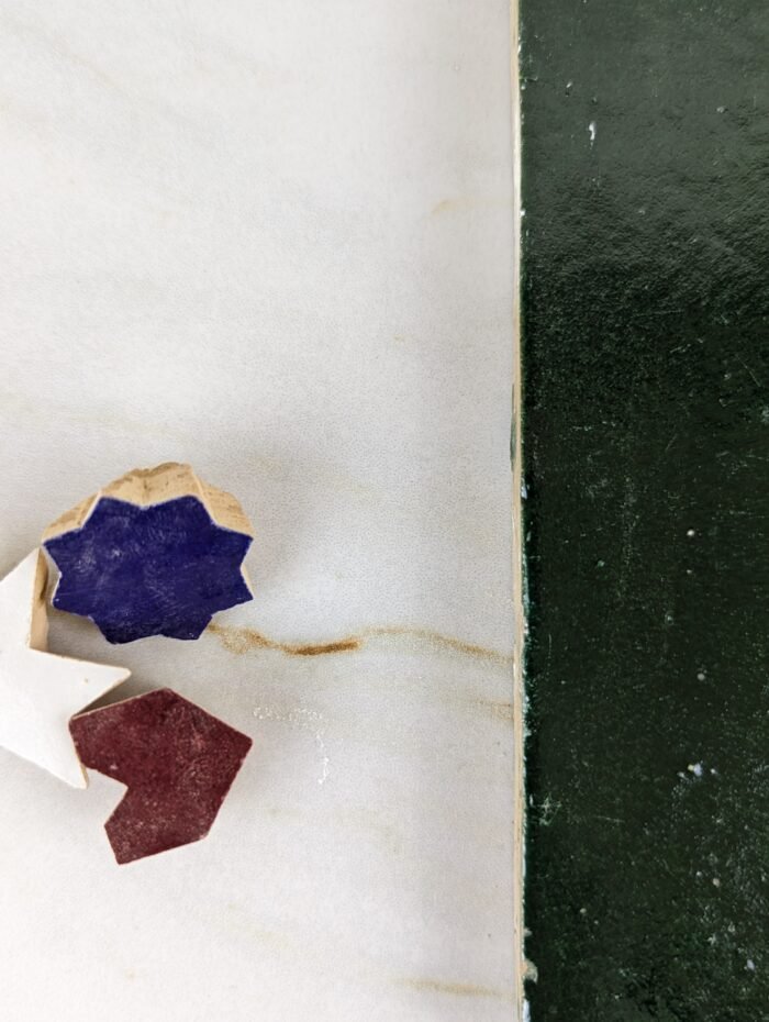 Cutting tiles is done in 3 steps: the drawing with a brush on the glazed tile of the geometric pattern (square, star, triangle, diamond, rounded shape, etc.), the manual cutting of the form by using a sharp hammer (« menqach »), and the bevelling of edges with a smaller hammer.