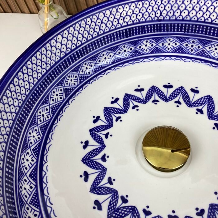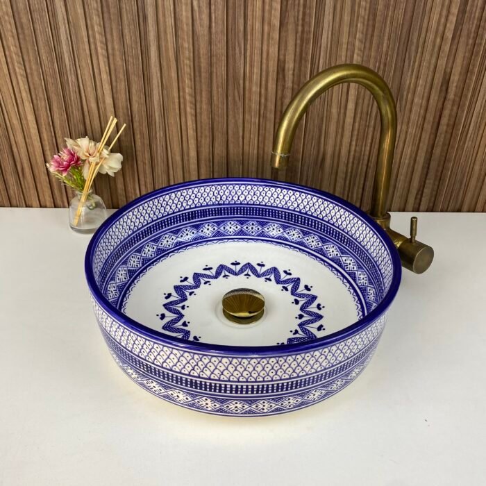 Hand-Painted Ceramic Sink with Brass Rim – Elegant Moroccan Design
